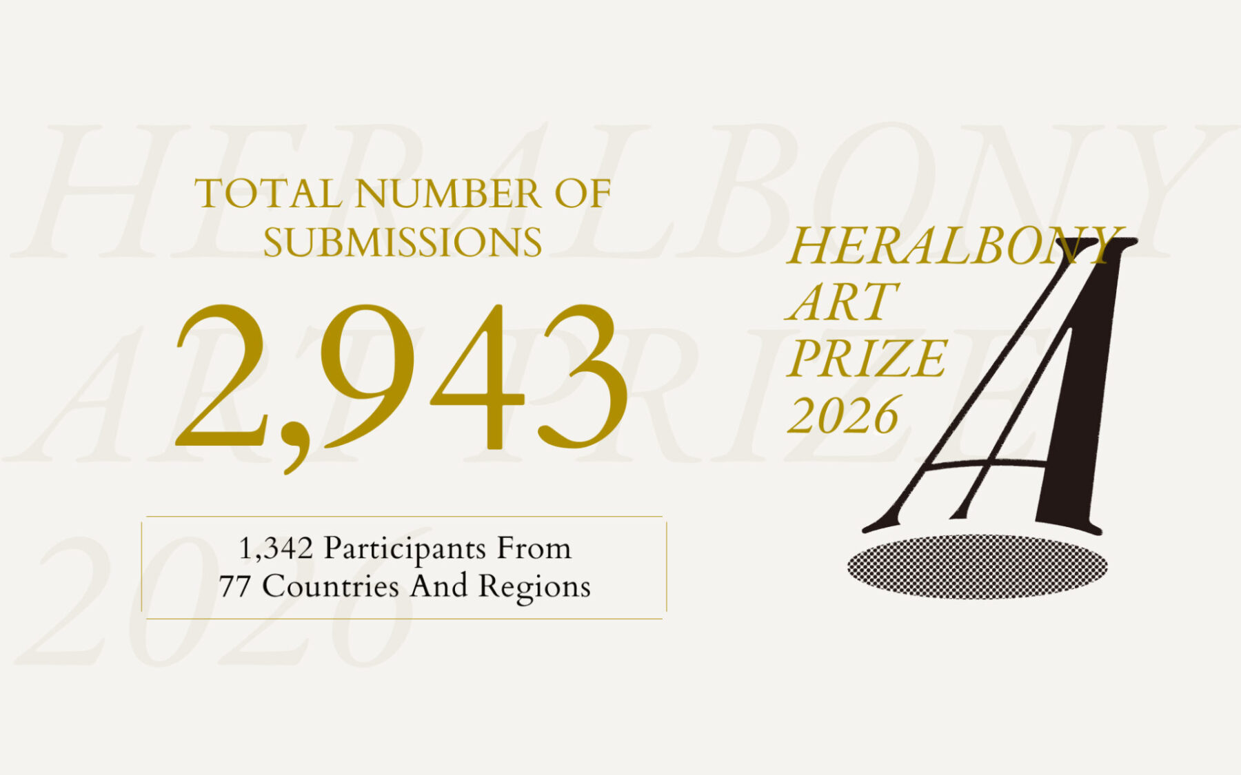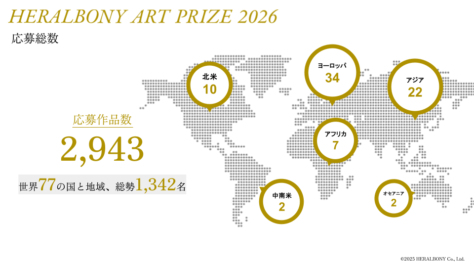 HERALBONY Co., Ltd. has closed submissions for the international art award, “HERALBONY Art Prize 2026”, on November 2, 2025. A total of 2,943 artworks were submitted by 1,342 artists from 77 countries and regions worldwide. We extend our heartfelt gratitude to all submissions.