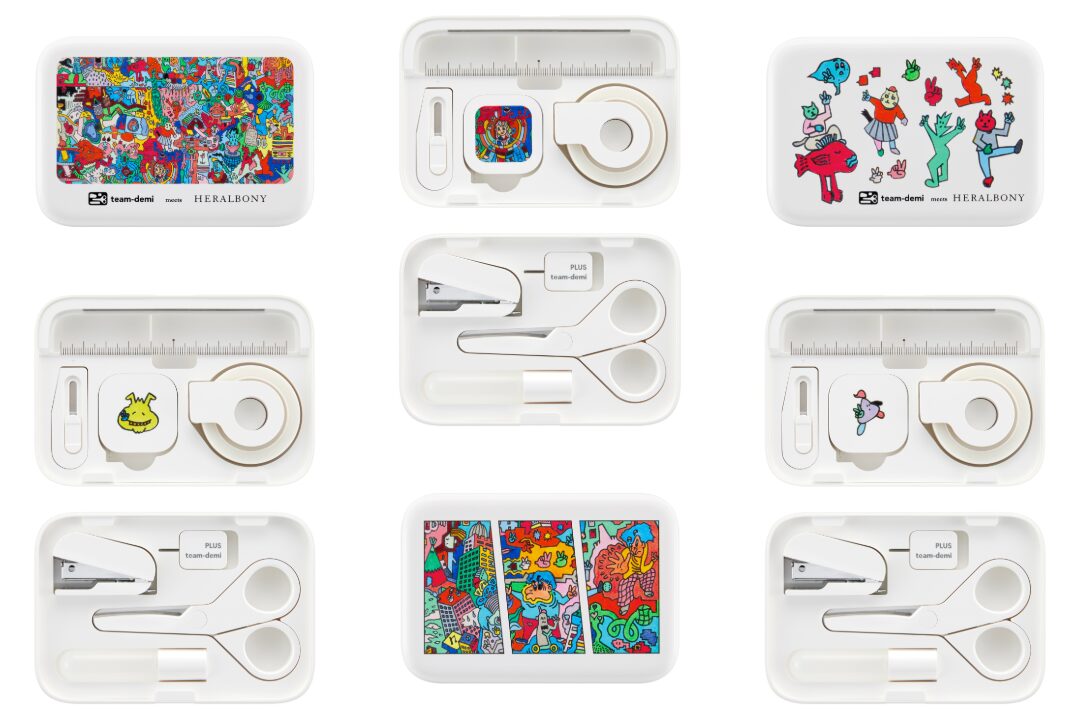 ヘラルボニーの契約作家によって描かれるアート作品は、先入観や常識の枠を超えた、心豊かな世界を表現しています。その独自性は、「チームデミ」の持つワクワク感や個性と共鳴しています。今回のコラボレーションは、プラスが誇る高いデザイン力と機能性を持つ「チームデミ」と、ヘラルボニーの唯一無二の異彩アートが融合することで実現しました。「愛着を持って長く使っていただきたい」という願いを込めた「チームデミ」は、文具の枠を超えた価値と喜びを提供する特別なステーショナリーセットです。日々の使用はもちろん、大切な人へのギフトとしても最適な商品です。