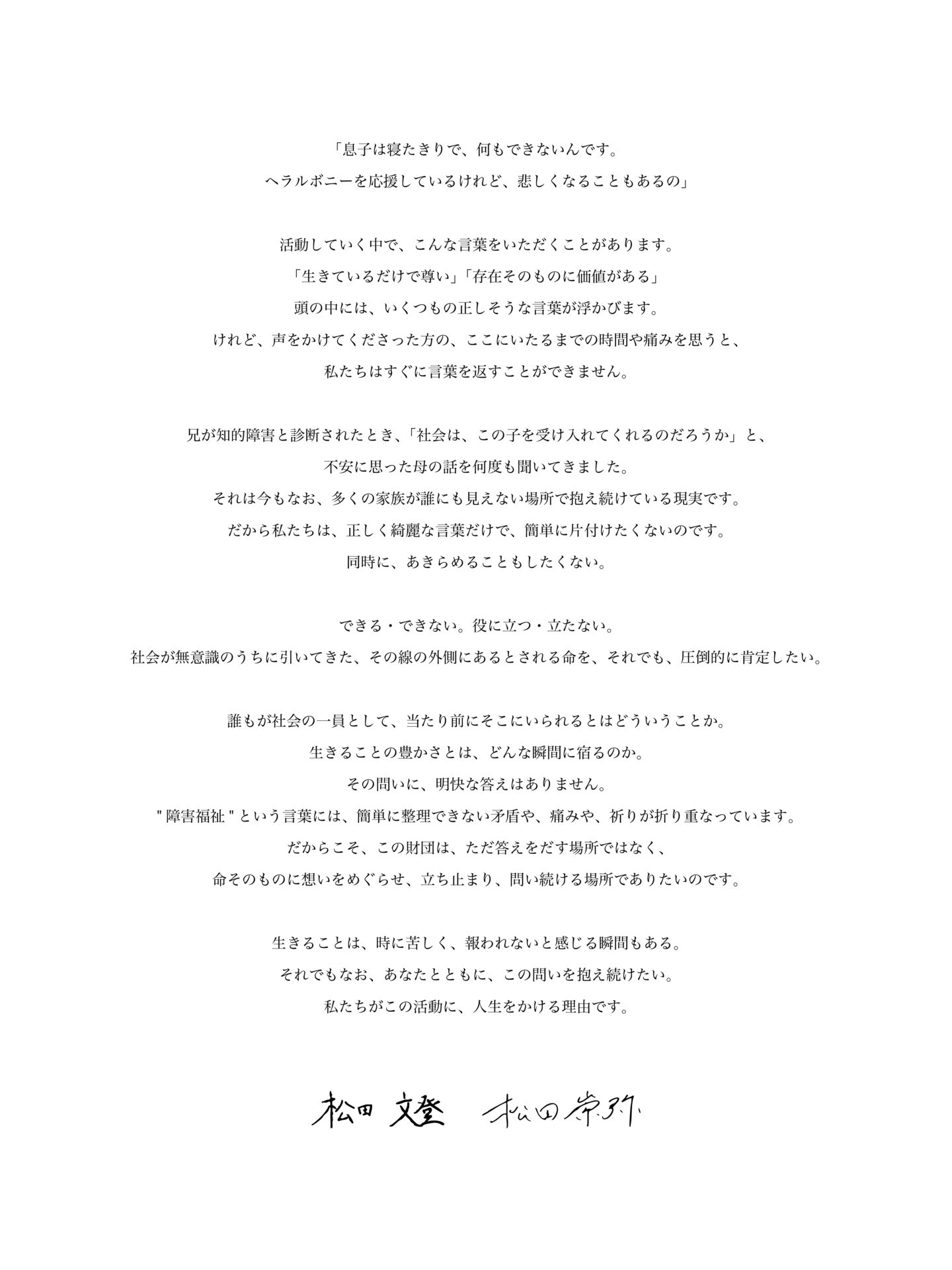 ヘラルボニー財団の創立には、株式会社ヘラルボニーの創業者である松田崇弥・文登が抱き続けてきた、「兄が幸せに生きる社会」を願う想いがあります。