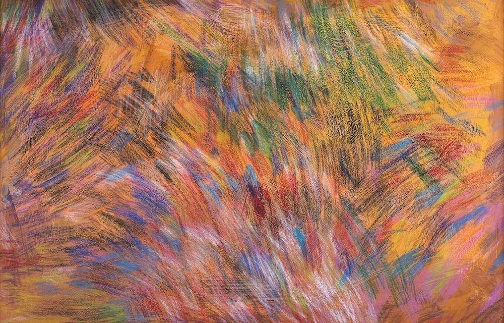 クーピーペンシルやクレヨンを塗り重ねることでつくり上げられた作品は、一見すると、素早い鉛筆の動きを要する激しい制作態度を連想させる。しかし実は、彼女の制作は非常にゆっくりと穏やかである。彼女の描き出す一つひとつの色は、お互いに交じり合うことなく、それぞれにその美しさを主張しながら画面の上に現れ、激しさと静けさが不思議に同居しており、心を惹きつけられずにはいられない。