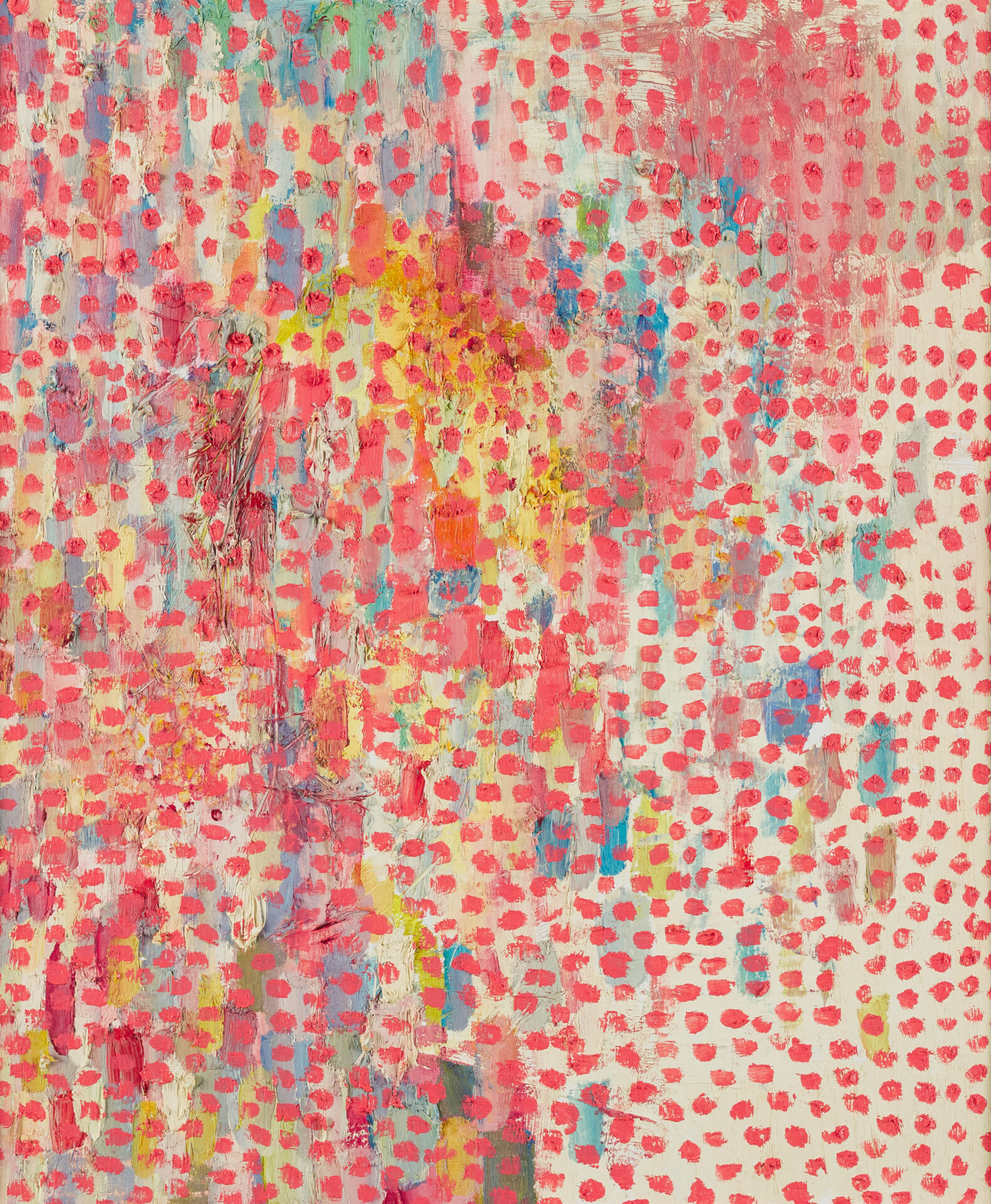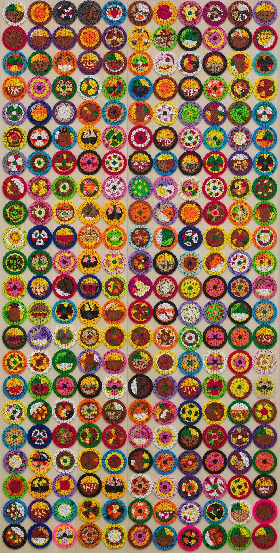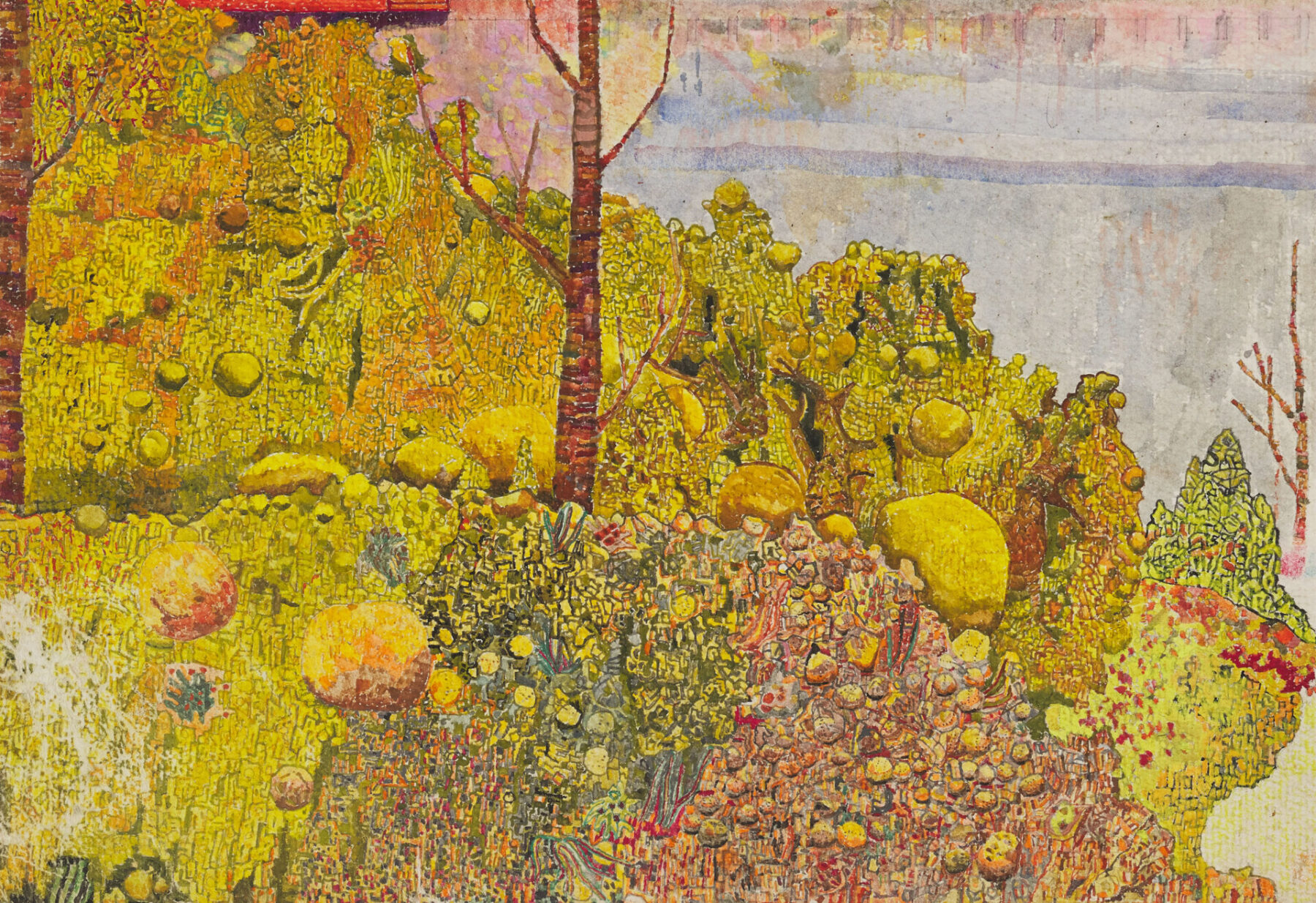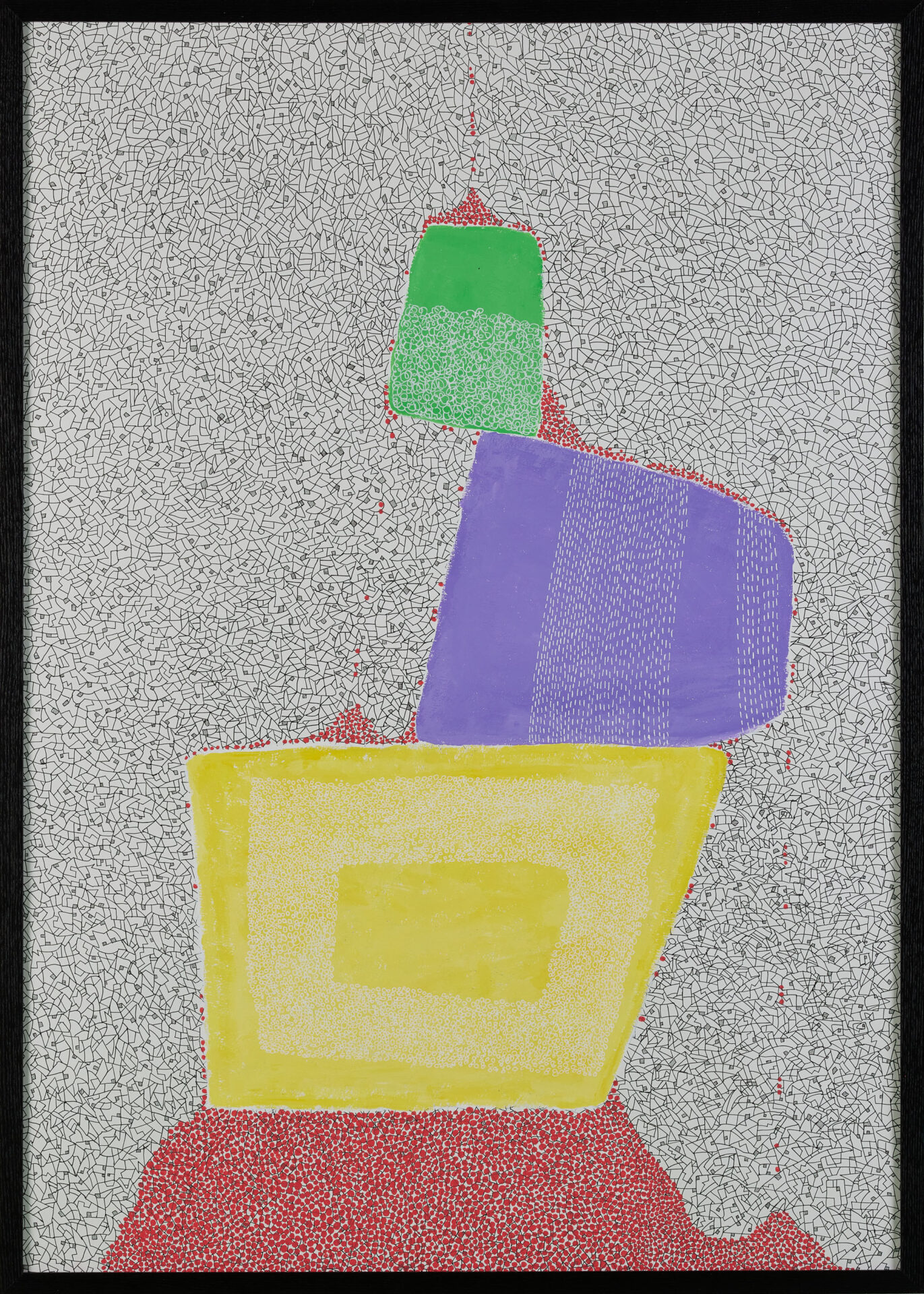 絵を描くことに幼いころから関心を示し、寡黙ながらひたむきに制作に向き合うカー・ハンを、両親は温かく支えてきた。当初はパステルや絵の具を用いていたが、ほどなく、自身の制作スタイルには、色鉛筆がより適していることに気づく。描き続けるにつれて作品はさらに洗練され、徐々に抽象性を増していく。大きな白い紙の上に鋭く削った色鉛筆を用いて、幾層にも色を重ねる。何か月にもわたり、深い集中力とエネルギーをもって描き続けることで、作品は次第に鮮やかな輝きを帯びていく。そうして生み出された形象の連なりは、布地や絨毯、あるいは刺繍を思わせる趣を感じさせる。