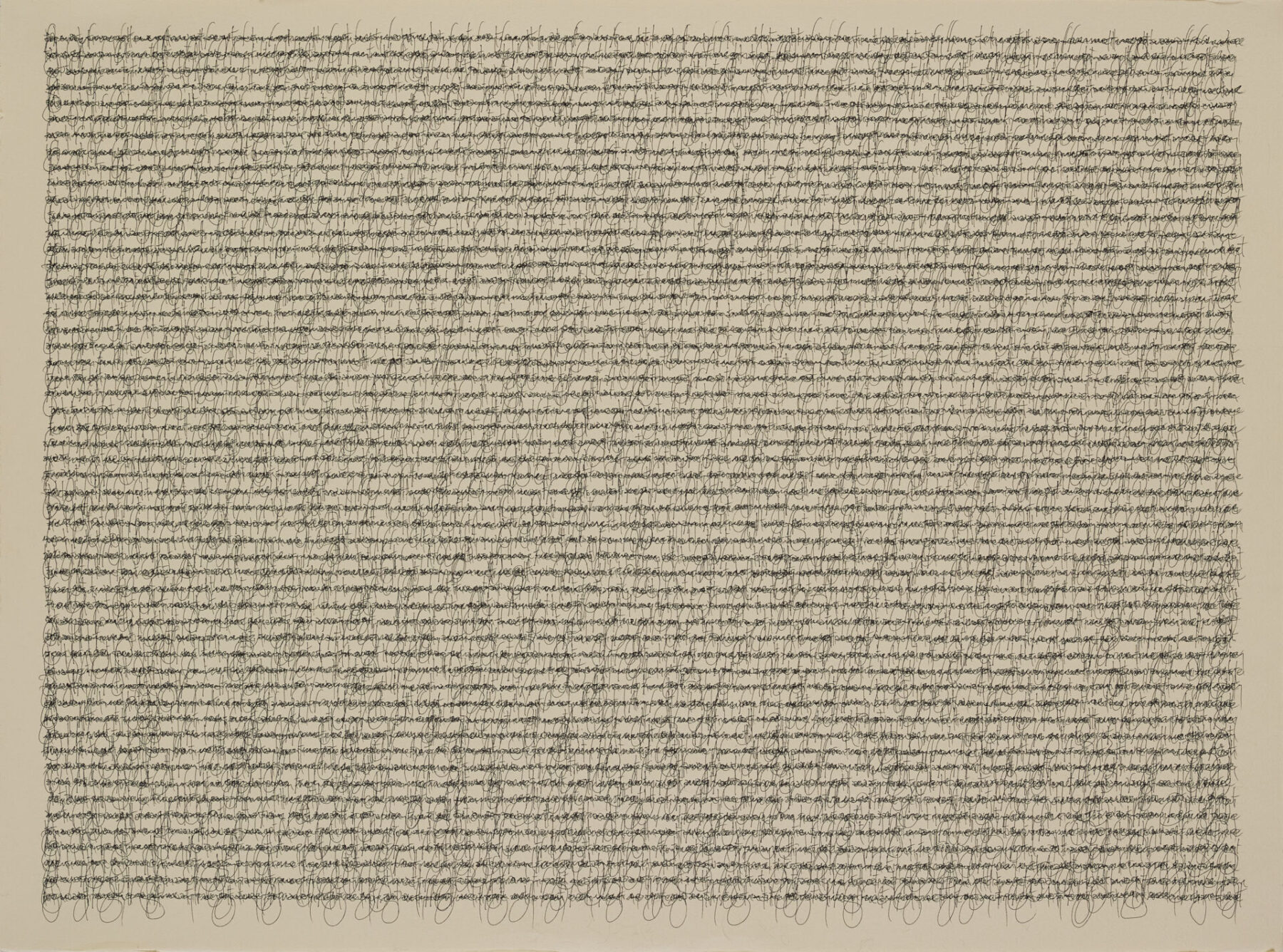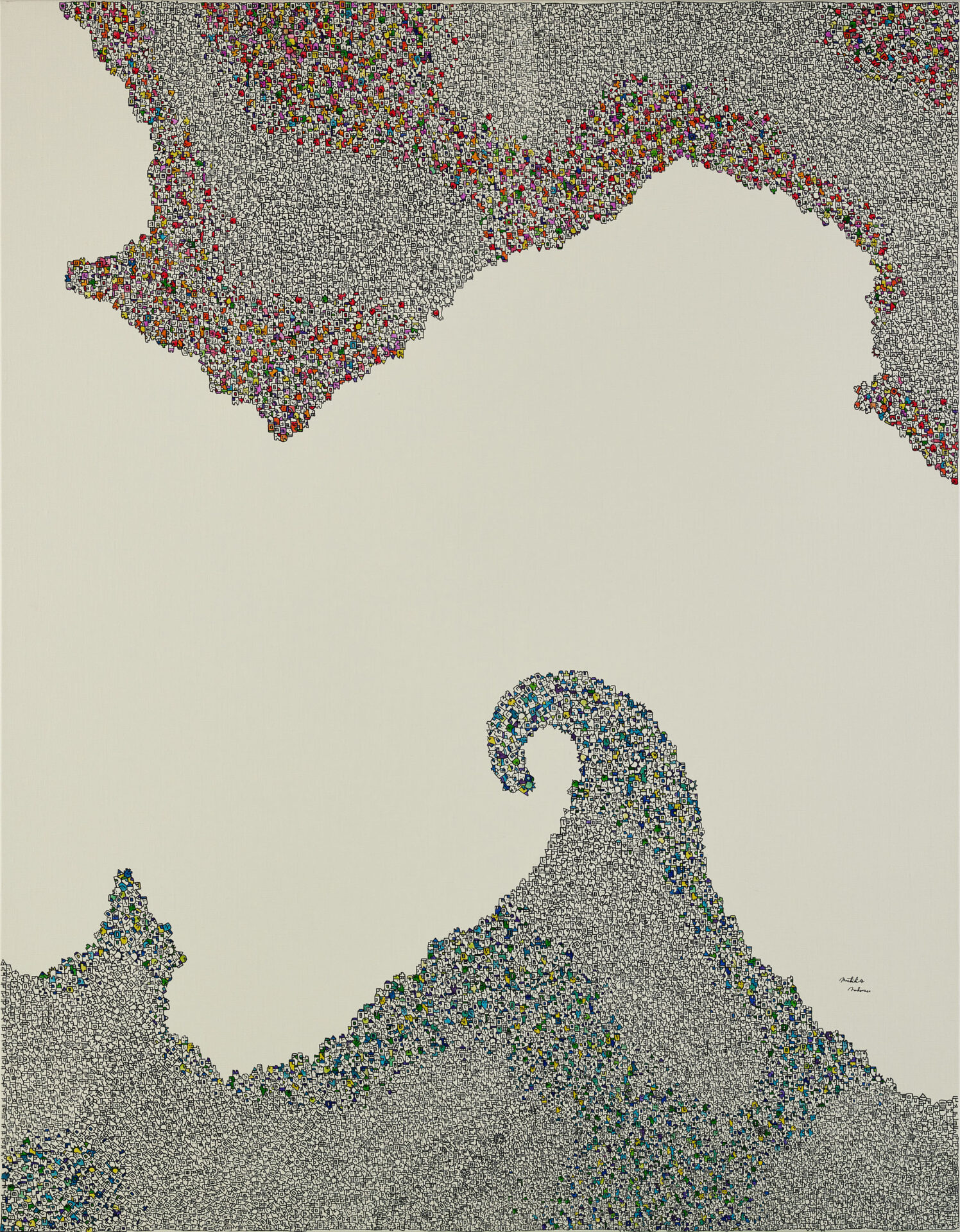 カー・ハン・ムイの作品の大胆な構成には、一目で強く惹きつけられた。画面の下部は、円形と反復する渦巻きの有機的な集合体で満たされ、上三分の一は、線的なテクスチャーの力強いまとまりと暗色の帯状の層によって占められている。こうした要素の組み合わせは、形式的抽象への確かな感覚がうかがえると同時に、地図や考古学的図版を彷彿とさせる。緑がかった茶色と黒を基調とする色彩は、隠された構造を掘り起こし、その姿を地中からあらわにするような感覚をいっそう際立たせる。その印象は、オーストリア生まれの建築家・芸術家フリーデンスライヒ・フンデルトヴァッサーによる、生物形態的な住宅建築や環境に配慮したデザインにも通じる。カー・ハン・ムイが提示する世界。それは庭園であり、ポータル(門)でもある。どこか人を惹きつけてやまない場所であり、私たちそれぞれの物語が展開していく舞台背景となる空間なのだ。